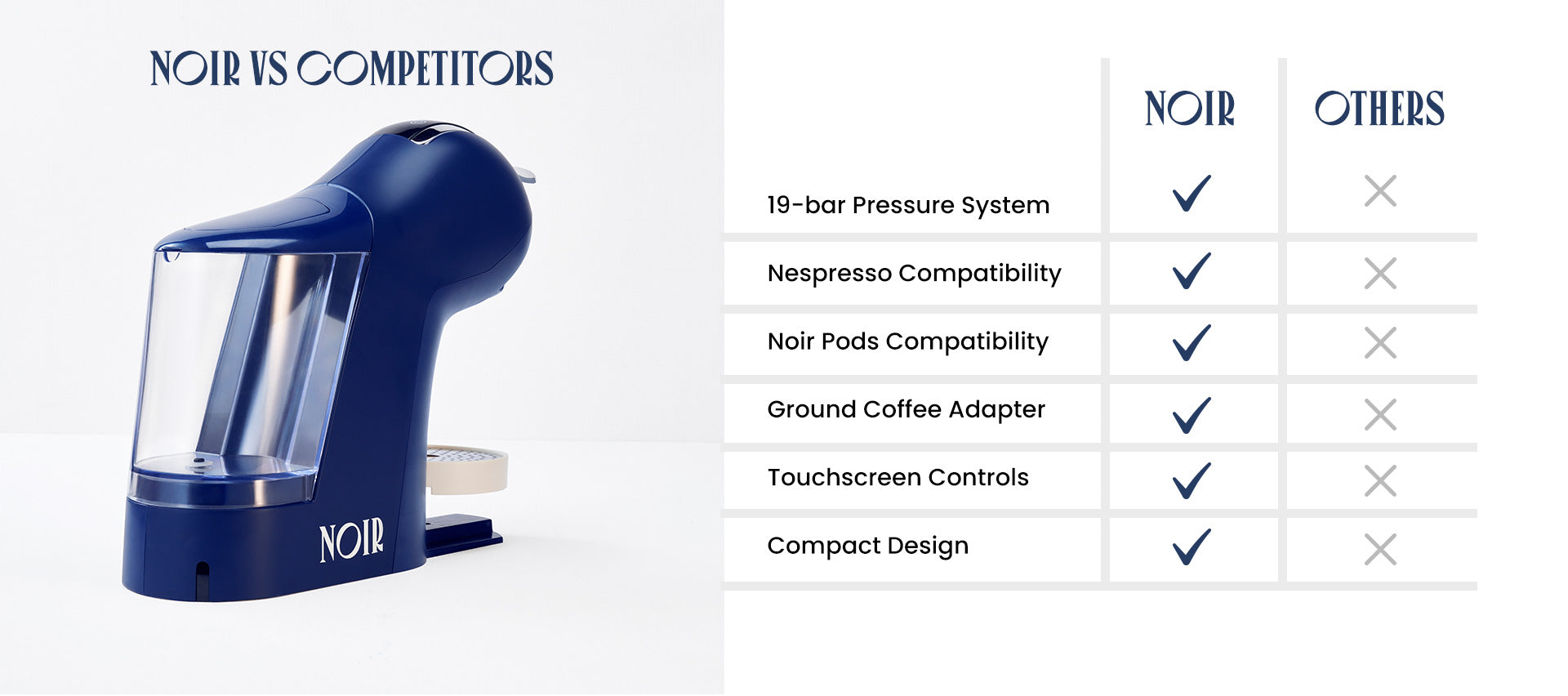 Love convenience and flavor? The Noir Azure adapts to your mood. Whether it’s your favorite Noir pod or a Nespresso® pod, the machine makes every brew a breeze. Your choices are endless, and your coffee always perfect.