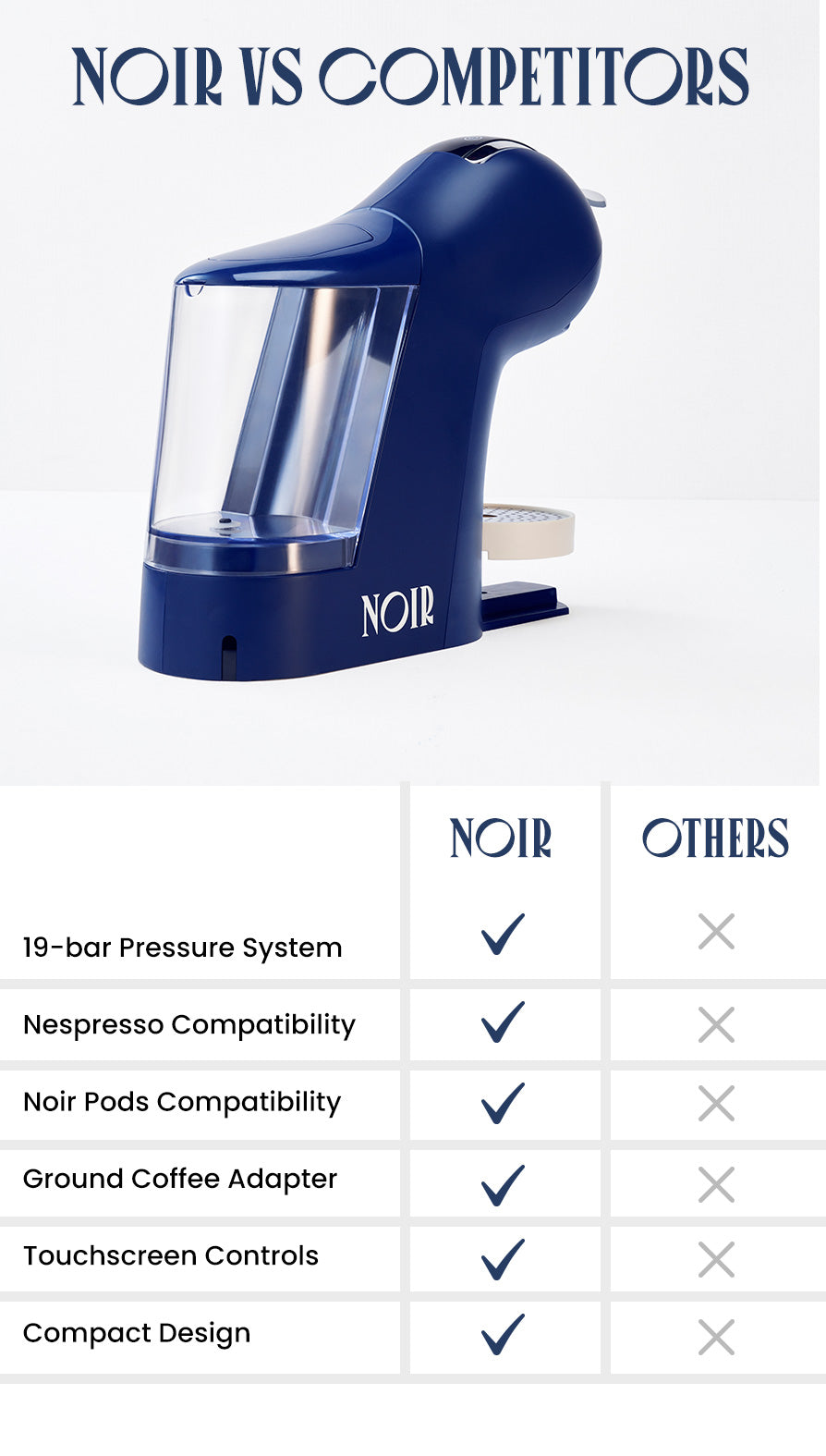 With the Noir Azure Coffee Machine, you’re not just brewing—you’re creating. Whether it’s a strong espresso to start your day or a rich cappuccino for an afternoon pick-me-up, this machine takes your coffee moments to the next level. Equipped with a 19-bar pressure system, Noir Azure ensures that every cup is bursting with flavor and topped with a creamy crema, just like your favorite café. Plus, its versatility doesn’t stop at coffee. Use Noir pods, Nespresso® pods, or the ground coffee adapter for freshly brewed beans—all with a simple touch. Compact, energy-efficient, and designed to make you feel like a barista, Noir Azure is the perfect addition to your home or office.